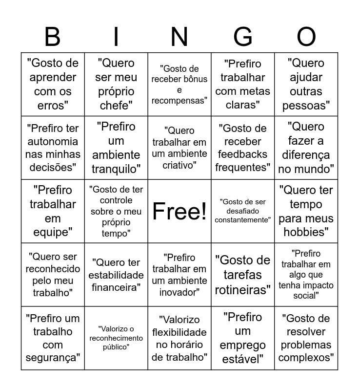 This bingo card has a free space and 34 words: "Quero ganhar muito dinheiro", "Prefiro um emprego estável", "Gosto de desafios", "Amo aprender coisas novas", "Quero ser reconhecido pelo meu trabalho", "Prefiro um ambiente tranquilo", "Quero ajudar outras pessoas", "Prefiro um trabalho com segurança", "Quero ser meu próprio chefe", "Valorizo o equilíbrio entre trabalho e vida pessoal", "Quero trabalhar em um ambiente criativo", "Gosto de receber bônus e recompensas", "Prefiro seguir uma carreira com muita liberdade", "Preciso de oportunidades de crescimento", "Gosto de ser desafiado constantemente", "Quero fazer a diferença no mundo", "Valorizo o reconhecimento público", "Prefiro trabalhar em equipe", "Quero ter estabilidade financeira", "Gosto de tarefas rotineiras", "Prefiro trabalhar em um ambiente inovador", "Quero ser promovido rapidamente", "Gosto de aprender com os erros", "Quero ter tempo para meus hobbies", "Valorizo flexibilidade no horário de trabalho", "Gosto de resolver problemas complexos", "Prefiro trabalhar com metas claras", "Quero ser respeitado pelos meus colegas", "Gosto de receber feedbacks frequentes", "Prefiro ter autonomia nas minhas decisões", "Quero ter oportunidades para viajar a trabalho", "Gosto de ter controle sobre o meu próprio tempo", "Prefiro trabalhar em algo que tenha impacto social" and "Quero ter desafios intelectuais no trabalho".
