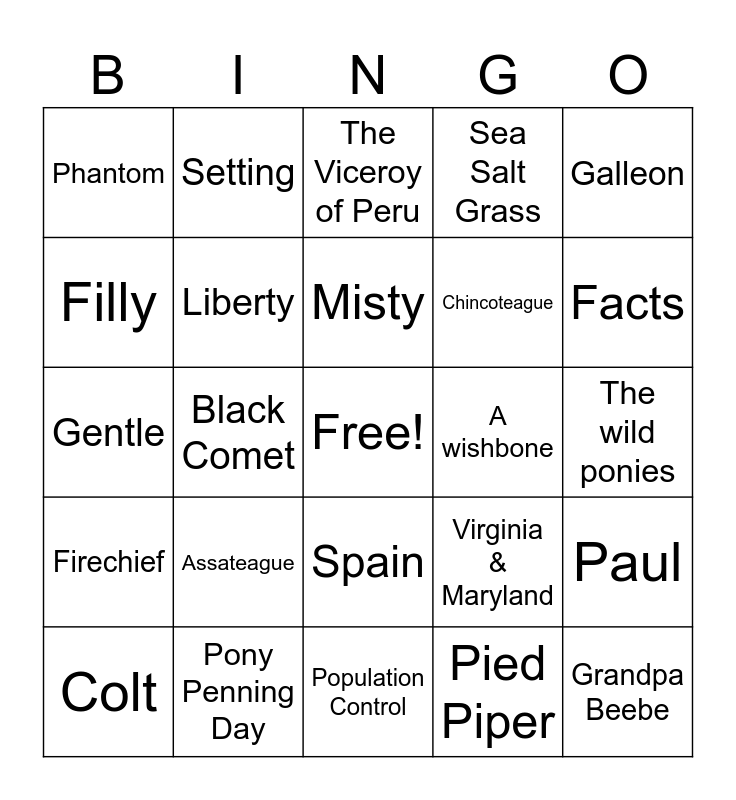 This bingo card has a free space and 24 words: Assateague, Pony Penning Day, Misty, Colt, Galleon, Phantom, Filly, Setting, A wishbone, Spain, Chincoteague, Gentle, Virginia & Maryland, Paul, Liberty, Pied Piper, The wild ponies, The Viceroy of Peru, Facts, Black Comet, Grandpa Beebe, Firechief, Sea Salt Grass and Population Control.