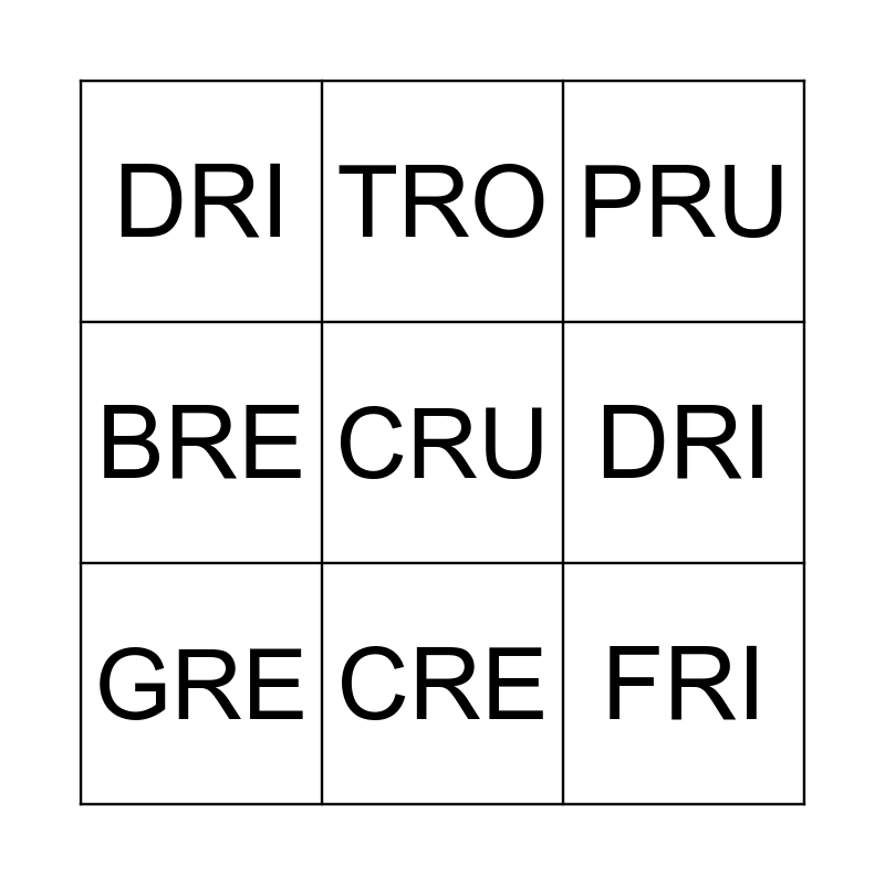 This bingo card has a free space and 11 words: BRA, CRE, FRI, GRE, TRO, PRU, DRI, GRA, BRE, DRI and TRU.