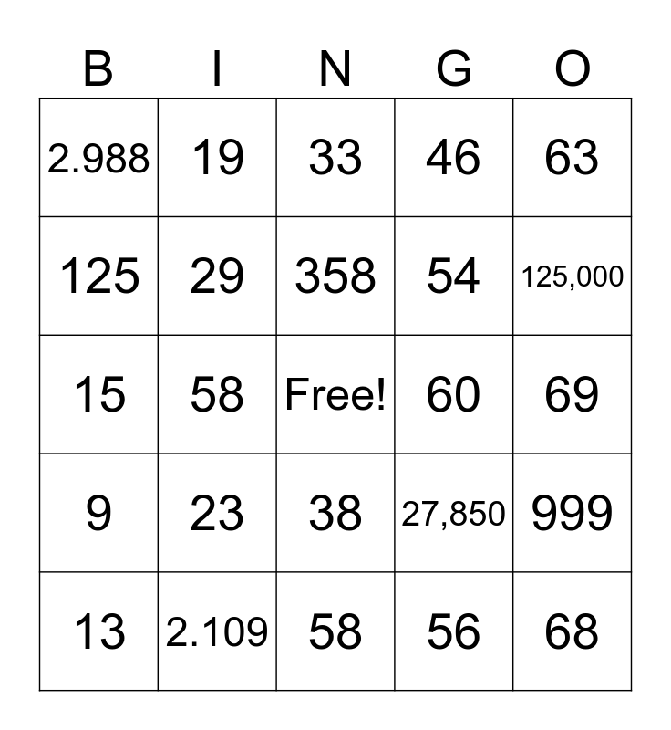 This bingo card has a free space and 99 words: 1, 16, 31, 46, 61, 2, 17, 32, 47, 62, 3, 18, 48, 63, 4, 19, 33, 49, 64, 5, 20, 34, 50, 65, 609, 2.109, 358, 5.100.000, 66.000, 7, 822, 369, 952, 267, 2.988, 23, 37, 53, 68, 9, 24, 38, 54, 69, 10, 25, 39, 55, 70, 11, 26, 40, 56, 71, 12, 27, 41, 57, 72, 13, 28, 42, 58, 73, 14, 29, 74, 59, 74, 15, 30, 58, 60, 75, 45, 23, 58, 74, 91, 36, 125, 342, 589, 763, 999, 1,234, 5,678, 10,500, 27,850, 125,000, 345,678, 760,432, 890,001, 1,500,000, 2,345,678, 5,000,000, 12,345,678, 45,000,000 and 99,999,999.