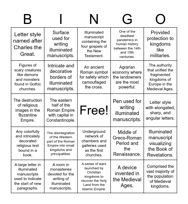 This bingo card has a free space and 24 words: The disintegration of the Western part of the Roman Empire into small kingdoms and principalities., A room in monasteries devoted for the writing of illuminated manuscripts., An ancient Roman symbol for safety which camouflaged the cross., A large letter in illuminated manuscripts used to indicate the start of new paragraphs., Provided protection to kingdoms like militaries., Letter style named after Charles the Great., Figures of scary creatures like demons and monsters found in Gothic churches., Surface used for writing illuminated manuscripts., Pen used for writing illuminated manuscripts., Underground network of chambers and galleries used as the first churches., Agrarian economy where the landowners are the most powerful., The destruction of religious images in the Byzantine Empire., Middle of Greco-Roman Period and the Renaissance., Illuminated manuscript visualizing the Book of Revelations., Intricate and decorative borders of illuminated manuscripts., A device invented in the Medieval Ages., Letter style with elongated, sharp, and angular letters., Illuminated manuscript containing the four gospels of the New Testament., The authority that unified the fragmented kingdoms of Europe in the Medieval Ages., The eastern half of the Roman Empire with capital in Constantinople., Comprised the vast majority of the population of Medieval kingdoms., Any colorfully and intricately decorated religious text bound in a book., One of the deadliest pandemics in human history between the 14th and 15th centuries. and A series of wars launched by Christian kingdoms to recover the Holy Land from the Islamic Empire..