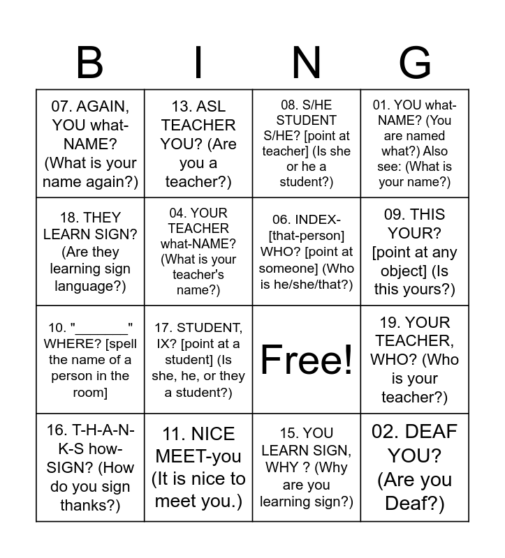 This bingo card has 21 words: 11. NICE MEET-you (It is nice to meet you.), 12. HEARING YOU? (Are you a Hearing person?), 13. ASL TEACHER YOU? (Are you a teacher?), 14. YOU LEARN SIGN, WHERE? (Where are you learning sign?), 15. YOU LEARN SIGN, WHY ? (Why are you learning sign?), 06. INDEX-[that-person] WHO? [point at someone] (Who is he/she/that?), 07. AGAIN, YOU what-NAME? (What is your name again?), 08. S/HE STUDENT S/HE? [point at teacher] (Is she or he a student?), Free!, 09. THIS YOUR? [point at any object] (Is this yours?), 10. "_______" WHERE? [spell the name of a person in the room], 01. YOU what-NAME? (You are named what?) Also see: (What is your name?), 02. DEAF YOU? (Are you Deaf?), 03. STUDENT YOU? (Are you a student?), 04. YOUR TEACHER what-NAME? (What is your teacher's name?), 05. YOU UNDERSTAND HE/SHE? (Do you understand him/her?), 16. T-H-A-N-K-S how-SIGN? (How do you sign thanks?), 17. STUDENT, IX? [point at a student] (Is she, he, or they a student?), 18. THEY LEARN SIGN? (Are they learning sign language?), 19. YOUR TEACHER, WHO? (Who is your teacher?) and 20. YOU LIKE LEARN SIGN? (Do you like learning sign language?).