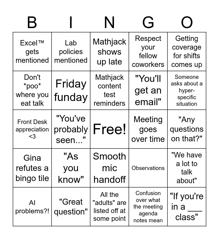 This bingo card has a free space and 27 words: Observations, “Undergrads clock in… (if you haven’t already)”, "You'll get an email", All the "adults" are listed off at some point, Don't *poo* where you eat talk, Mathjack shows up late, Lab policies mentioned, Gina refutes a bingo tile, Meeting goes over time, "We have a lot to talk about", Front Desk appreciation <3, Respect your fellow coworkers, AI problems?!, "Great question", Someone asks about a hyper-specific situation, Someone gets called out, Friday funday, Mathjack content test reminders, "As you know", Excel™️ gets mentioned, "Any questions on that?", Confusion over what the meeting agenda notes mean, "You've probably seen...", "If you're in a ___ class", Smooth mic handoff, Getting coverage for shifts comes up and "Some upcoming events...".
