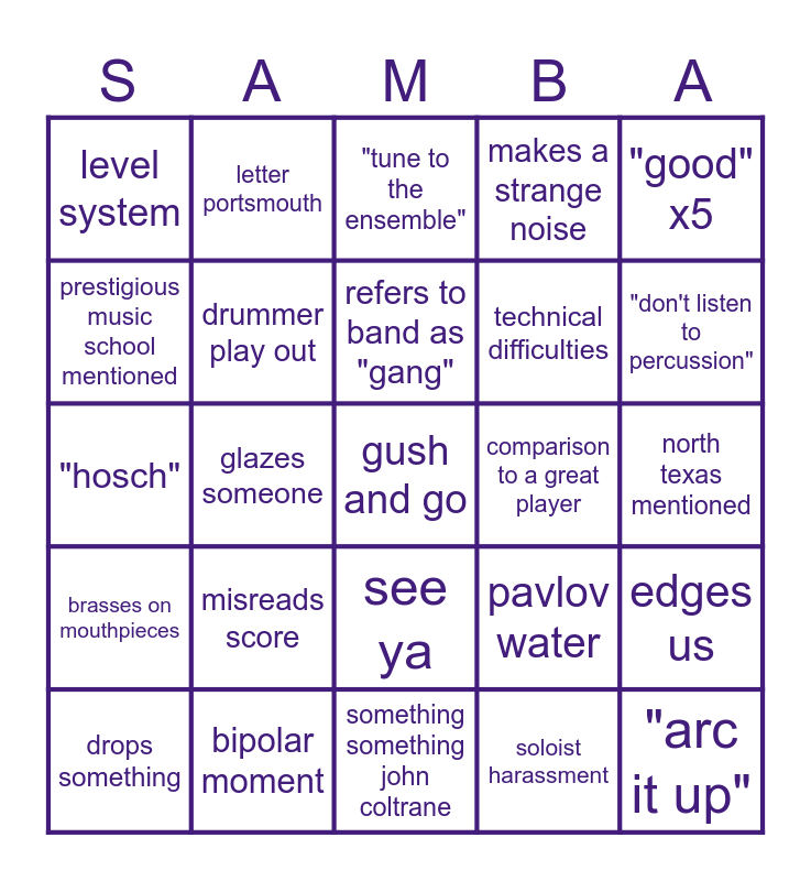 This bingo card has a free space and 56 words: "these are not gang signs", drops something, more air, level system, something something john coltrane, "left! left! left!", drummer play out, rushing/dragging, technical difficulties, singing, makes a strange noise, "more on that to come", "do you have this in your music as well", ____types, don't blast, CUT, "good" x5, glazes someone, play louder, "arc it up", comparison to a great player, feet mentioned, pavlov water, "tune to the ensemble", hands behind back, refers to band as "gang", tells a story, freshman melly/bassist, "don't listen to percussion", watch the major, "those are the words", starts counting, drum corps video, nyo jazz video, north texas mentioned, prestigious music school mentioned, "hosch", austin ford/summer camargo, brasses on mouthpieces, letter portsmouth, see ya, "hit it and get out of there", freddie hubbard mentioned, all out, dementia moment, misreads score, bipolar moment, dig in, bring it in, randomly says student's name, soloist harassment, marching band mention in class, pause and "yeahhhh", gets quiet, edges us and accents, offbeats, tie to ties.