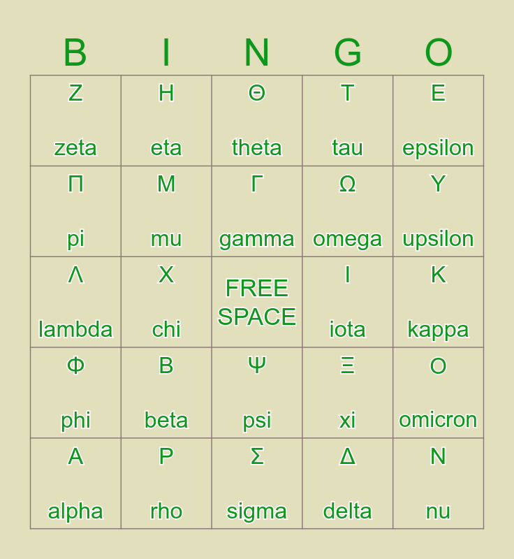 This bingo card has a free space and 24 words: A alpha, B beta, Γ gamma, Δ delta, E epsilon, Z zeta, H eta, Θ theta, I iota, K kappa, Λ lambda, M mu, Ξ xi, O omicron, Π pi, P rho, Σ sigma, T tau, Υ upsilon, Φ phi, X chi, Ψ psi, Ω omega and N nu.