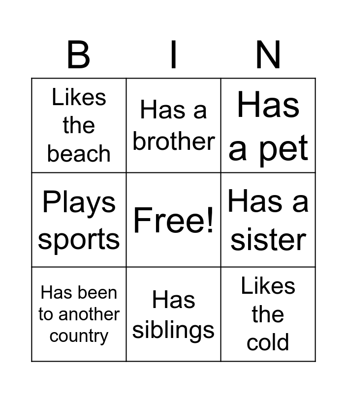 This bingo card has a free space and 9 words: Has been to another country, Has a pet, Has a brother, Plays sports, Likes the beach, Has a sister, Likes the cold, Likes music and Has siblings.