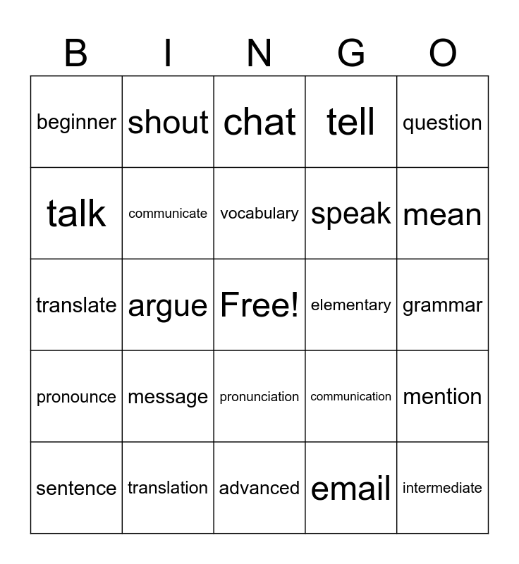This bingo card has a free space and 31 words: advanced, answer, argue, ask, beginner, chat, communicate, communication, elementary, email, grammar, intermediate, joke, letter, mean, meaning, mention, message, pronounce, pronunciation, question, say, sentence, shout, speak, talk, tell, translate, translation, vocabulary and word.