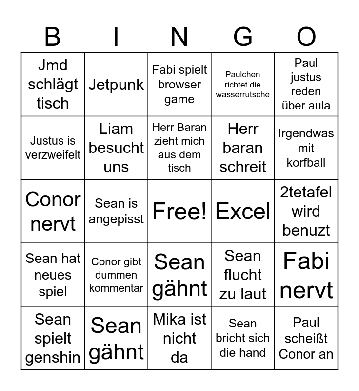 This bingo card has a free space and 28 words: Sean spielt genshin, Sean gähnt, Fabi spielt browser game, Paulchen richtet wasserrutsche, Paul justus reden über aula, Jmd schlägt tisch, Liam besucht uns, Herr Baran zieht mich aus dem tisch, Sean flucht zu laut, Fabi nervt, Conor nervt, Sean is angepisst, Sean bricht sich die hand, Paul scheißt Conor an, Justus is verzweifelt, Herr baran macht einzelgespräch, Mika ist nicht da, Herr baran schreit, Irgendwas mit korfball, Sean hat neues spiel, Jetpunk, Wir checken nts, Excel, 2tetafel wird benuzt, Conor gibt dummen kommentar, Sean gähnt, Paulchen richtet die wasserrutsche and Sean flucht zu laut.