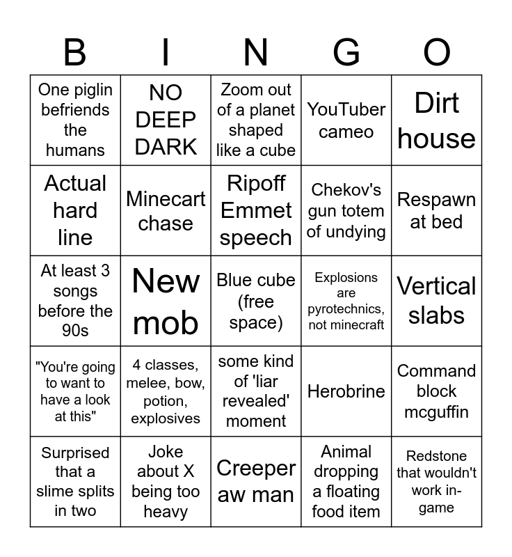 This bingo card has a free space and 44 words: Stupid crafting montage, Redstone that wouldn't work in-game, Some kind of game tie-in weapon or item, Surprised that a slime splits in two, Gotta cut down the rest of the tree, Animal dropping a floating food item, Zoom out of a planet shaped like a cube, End-themed sequel bait/General sequel bait, Dirt house, Joke about X being too heavy, YouTuber cameo, Explosions are pyrotechnics, not minecraft, some kind of 'liar revealed' moment, 4 classes, melee, bow, potion, explosives, Less than 5 real minecraft structures, Creeper aw man, Some new boss piglin, At least 3 songs before the 90s, "Don't move"/"It's behind me, isn't it", Respawn at bed, NO DEEP DARK, Unnecessary screaming, 'First we mine, then we craft', One piglin befriends the humans, Blocks not being proportional to humans/each other, Vertical slabs, Nonsensical crafting recipes, Jumanji story beats, Herobrine, "You're going to want to have a look at this", Alex cameo, Command block mcguffin, Nonsense world generation, Villagers that speak, New mob, Cringe joke, Fart joke, Netherite, Ripoff Emmet speech, Actual hard line, Chekov's gun totem of undying, Steve gets captured, Minecart chase and Title drop.