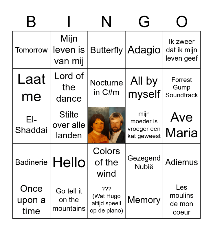 This bingo card has a free space and 24 words: Hello, Go tell it on the mountains, Nocturne in C#m, Once upon a time, Ik zweer dat ik mijn leven geef, Tomorrow, Laat me, Mijn leven is van mij, mijn moeder is vroeger een kat geweest, Colors of the wind, All by myself, El-Shaddai, Gezegend Nubië, Adiemus, Lord of the dance, Memory, Ave Maria, Butterfly, Forrest Gump Soundtrack, Stilte over alle landen, Les moulins de mon coeur, Badinerie, Adagio and ??? (Wat Hugo altijd speelt op de piano).