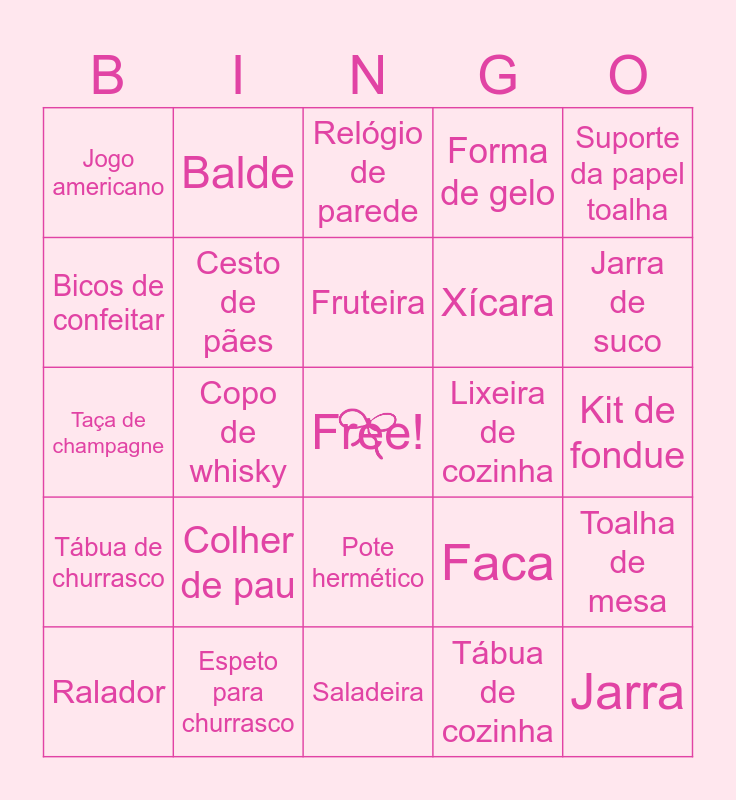 This bingo card has a free space and 58 words: Sanduicheira, Espeto para churrasco, Grelha para churrasco, Tábua de churrasco, Tábua de cozinha, Petisqueira, Cesto de pães, Bule, Xícara, Frigideira, Forma de gelo, Forma de bolo, Funil, Galheteiro, Garrafa térmica, Jogo americano, Jarra, Suporte da papel toalha, Porta guardanapo, Fruteira, Lixeira de cozinha, Relógio de parede, Ralador, Toalha de mesa, Descascador de legumes, Kit de fondue, Torradeira, Chaleira, Jarra de suco, Colher de silicone, Jogo de sorvete, Prato raso, Prato de sopa, Prato de sobremesa, Kit pizza, Panela de pressão, Jarra, Copo de whisky, Taça de champagne, Tesoura, Colher de pau, Garfo, Faca, Colher, Mexedor, Panela, Caçarola, Pote hermético, Saladeira, Açucareiro, Abridor de lata, Abridor de garrafa, Afiador de facas, Assadeira de vidro, Balde, Batedeira, Bicos de confeitar and Copo de medidas.