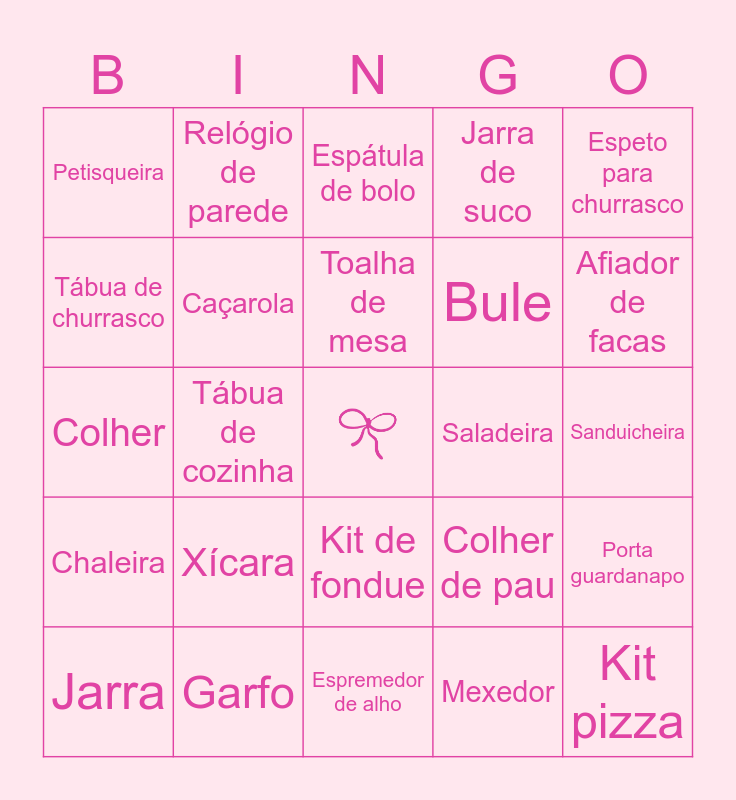 This bingo card has a free space and 66 words: Jogo americano, Jarra, Suporte da papel toalha, Porta guardanapo, Fruteira, Lixeira de cozinha, Relógio de parede, Ralador, Toalha de mesa, Descascador de legumes, Kit de fondue, Torradeira, Sanduicheira, Espeto para churrasco, Grelha para churrasco, Tábua de churrasco, Tábua de cozinha, Petisqueira, Cesto de pães, Bule, Xícara, Chaleira, Jarra de suco, Colher de silicone, Jogo de sorvete, Prato raso, Prato de sopa, Prato de sobremesa, Kit pizza, Panela de pressão, Jarra, Copo de whisky, Taça de champagne, Tesoura, Colher de pau, Garfo, Faca, Colher, Mexedor, Panela, Caçarola, Pote hermético, Saladeira, Açucareiro, Abridor de lata, Abridor de garrafa, Afiador de facas, Assadeira de vidro, Balde, Batedeira, Bicos de confeitar, Copo de medidas, Medidores, Concha, Cortador de pizza, Descanso de panela, Escorredor de arroz, Escorredor de talheres, Espátula de bolo, Espremedor de alho, Frigideira, Forma de gelo, Forma de bolo, Funil, Galheteiro and Garrafa térmica.