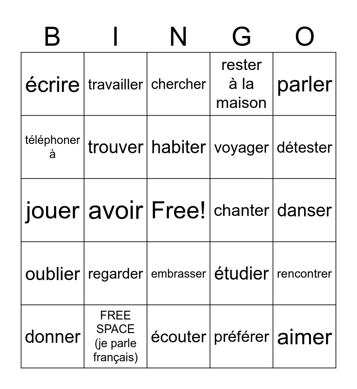 This bingo card has a free space and 30 words: FREE SPACE (je parle français), lire, avoir, être, écrire, chercher, trouver, embrasser, chanter, écouter, danser, aimer, préférer, adorer, détester, habiter, étudier, oublier, regarder, parler, jouer, nager, travailler, voyager, téléphoner à, rester à la maison, rencontrer, donner, habiter and montrer.