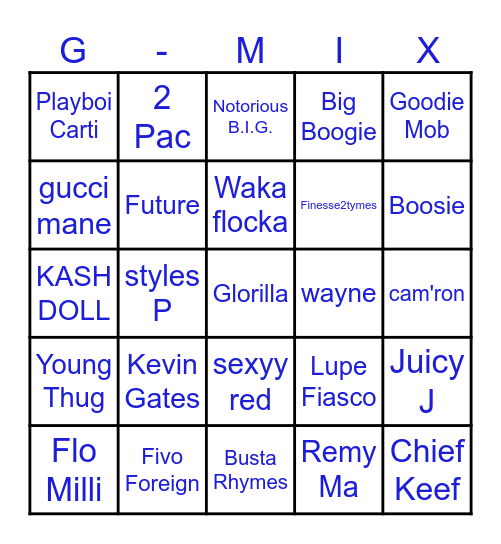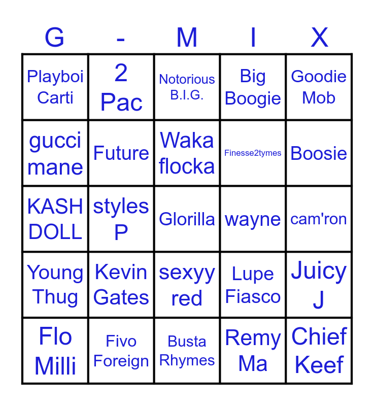 This bingo card has 102 words: Lil Scrappy,, slim shady, Goodie Mob, Project Pat, Gucci Mane, Young Jeezy, jay-z, Lil Wayne, Juvenile, Trick Daddy, Lil John, Flo Rida, Trina, Megan Thee Stallion, Scarface, Ludacris, Young Thug, Ace Hood, Yo Gotti, yella be, Plies, YFN Lucci, Rich Homie Quan, T-Pain, Travis Porter, Boosie, Big Boogie, Kevin Gates, Moneybagg yo, NBA Youngboy, 2 Pac, Notorious B.I.G., Meek Mills, Lil Kim, Nicki Minaj, sexyy red, Latto, Connie Diiamond, KASH DOLL, Remy Ma, Cardi B, Asian Doll, Flo Milli, Young M.A, Coi Leray, Saweetie, Ice Spice, Finesse2tymes, Tee Grizzley, Kendrick Lamar, SNOOP DOGG, migos, gucci mane, Shawty -Lo, Lil-Kim, TI, Dmx, Master P, kanye west, Glorilla, Lil Baby, Da Baby, Drake, Kodak Black, King Von, Young Dolph, Rick Ross, cam'ron, styles P, Fivo Foreign, DJ Khaled, Pop Smoke, Chief Keef, 2 Chainz, Tyler the Creator, Young M.A., Future, J. Cole, Migos, 21 Savage, GloRilla, Jack Harlow, Jim Jones, wayne, Master p, Waka flocka, megan thee stallion, missy elliott, Nas, 50 Cent, A$AP Rocky, Lupe Fiasco, Big Sean, Travis Scott, Tyga, Busta Rhymes, Playboi Carti, Juice WRLD, Juicy J, Bun B, fetty wap and French Montana.