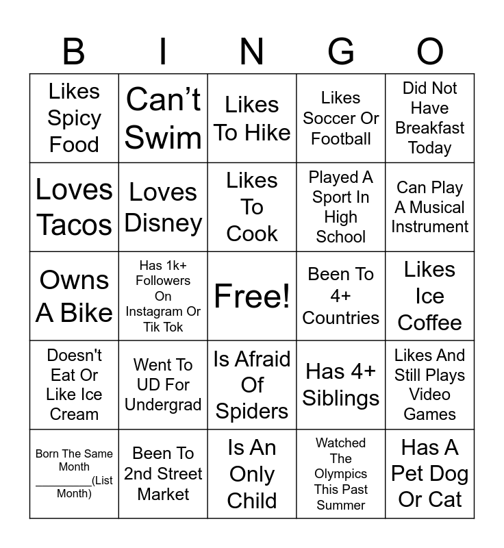 This bingo card has a free space and 25 words: Went To UD For Undergrad, Is An Only Child, Likes To Cook, Born The Same Month _________(List Month), Did Not Have Breakfast Today, Likes Spicy Food, Loves Tacos, Can’t Swim, Been To 4+ Countries, Is Afraid Of Spiders, Played A Sport In High School, Owns A Bike, Has 4+ Siblings, Likes And Still Plays Video Games, Loves Disney, Been To A UD Basketball Game, Likes Ice Coffee, Likes To Hike, Can Play A Musical Instrument, Has 1k+ Followers On Instagram Or Tik Tok, Has A Pet Dog Or Cat, Been To 2nd Street Market, Doesn't Eat Or Like Ice Cream, Likes Soccer Or Football and Watched The Olympics This Past Summer.