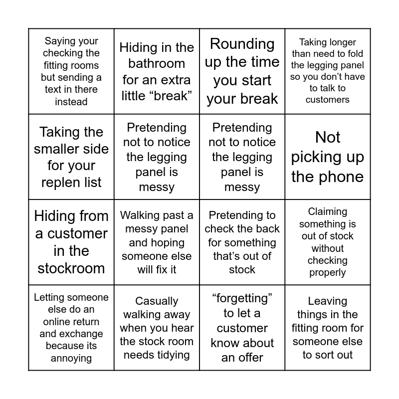 ⚠ This card has duplicate items: Complaining about a customer (2), Pretending to check the back for something that’s out of stock (2), Hiding from a customer in the stockroom (2), Pretending not to notice the legging panel is messy (2), Avoided a customer you know has a click and collect (2), Getting someone else to price whilst you tag (2), Not picking up the phone (2), Taking an extra long bathroom break to avoid a difficult customer (2), Taking the smaller side for your replen list (2), Leaving things in the fitting room for someone else to sort out (2), Claiming something is out of stock without checking properly (2), Taking longer than need to fold the legging panel so you don’t have to talk to customers (2), Letting someone else do an online return and exchange because its annoying (2), “forgetting” to let a customer know about an offer (2), Casually walking away when you hear the stock room needs tidying (2), Walking past a messy panel and hoping someone else will fix it (2), Putting away stock downstairs to avoid hoovering in the morning (2), Saying your checking the fitting rooms but sending a text in there instead (2), Hiding in the bathroom for an extra little “break” (2), Rounding up the time you start your break (2)