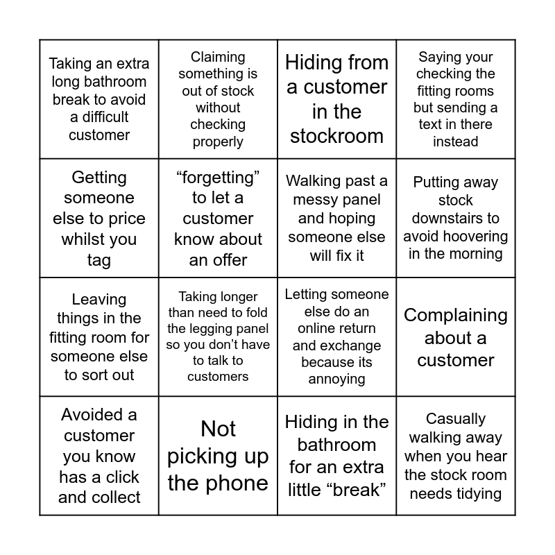 This bingo card has 20 words: Complaining about a customer, Pretending to check the back for something that’s out of stock, Hiding from a customer in the stockroom, Pretending not to notice the legging panel is messy, Avoided a customer you know has a click and collect, Getting someone else to price whilst you tag, Not picking up the phone, Taking an extra long bathroom break to avoid a difficult customer, Leaving things in the fitting room for someone else to sort out, Claiming something is out of stock without checking properly, Taking longer than need to fold the legging panel so you don’t have to talk to customers, Letting someone else do an online return and exchange because its annoying, “forgetting” to let a customer know about an offer, Casually walking away when you hear the stock room needs tidying, Walking past a messy panel and hoping someone else will fix it, Taking the smaller side for your replen list, Putting away stock downstairs to avoid hoovering in the morning, Saying your checking the fitting rooms but sending a text in there instead, Hiding in the bathroom for an extra little “break” and Rounding up the time you start your break.