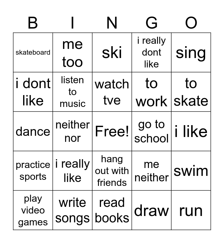 This bingo card has a free space and 24 words: i really like, write songs, watch tve, play video games, sing, skateboard, i dont like, me too, go to school, hang out with friends, to work, dance, me neither, swim, listen to music, draw, i like, ski, to skate, neither nor, run, practice sports, i really dont like and read books.