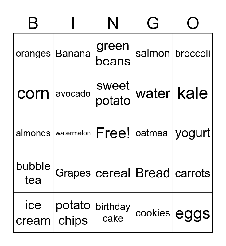 This bingo card has a free space and 24 words: Grapes, potato chips, sweet potato, ice cream, broccoli, oranges, corn, Banana, oatmeal, cereal, water, almonds, Bread, carrots, avocado, cookies, yogurt, green beans, kale, watermelon, eggs, bubble tea, salmon and birthday cake.