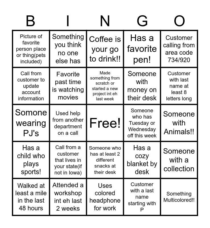 This bingo card has a free space and 24 words: Call from a customer that lives in your state(if not in Iowa), Attended a workshop int eh last 2 weeks, Made something from scratch or started a new project int eh last week, Walked at least a mile in the last 48 hours, Customer calling from area code 734/920, Picture of favorite person place or thing(pets included), Call from customer to update account information, Something you think no one else has, Someone who has Tuesday or Wednesday off this week, Someone who has at least 2 different snacks at their desk, Someone with money on their desk, Somone wearing PJ's, Has a cozy blanket by desk, Someone with a collection, Favorite past time is watching movies, Customer with a last name starting with P, Someone with Animals!!, Coffee is your go to drink!!, Customer with last name at least 8 letters long, Used help from another department on a call, Something Multicolored!!, Has a child who plays sports!, Has a favorite pen! and Uses colored headphone for work.