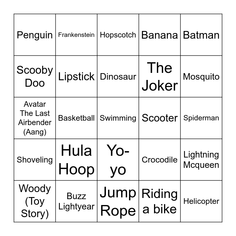 This bingo card has a free space and 33 words: Driving a car, Baseball, Basketball, Spongebob, Shoveling, Lipstick, Batman, Woody (Toy Story), Frankenstein, Hauling a taxi, Dinosaur, Hopscotch, Ping Pong, Violin, Scooter, Mosquito, Buzz Lightyear, Avatar The Last Airbender (Aang), Hula Hoop, Crocodile, Yo-yo, Stairs, Penguin, Spiderman, Jump Rope, Helicopter, Banana, The Joker, Scooby Doo, Lightning Mcqueen, Zombie, Riding a bike and Trumpet.