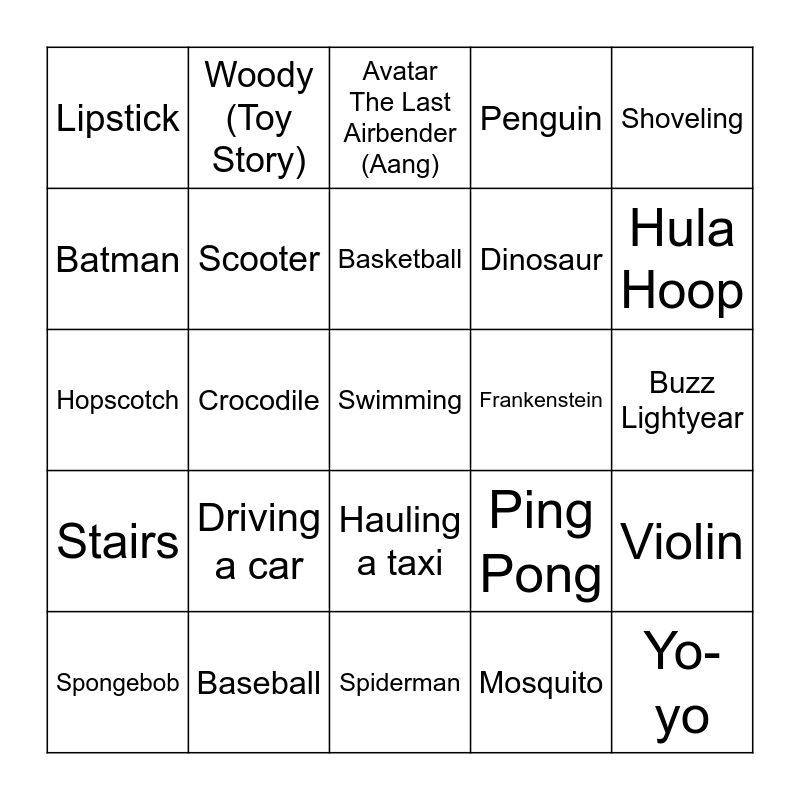 This bingo card has a free space and 24 words: Driving a car, Baseball, Basketball, Spongebob, Shoveling, Lipstick, Batman, Woody (Toy Story), Frankenstein, Hauling a taxi, Dinosaur, Hopscotch, Ping Pong, Violin, Scooter, Mosquito, Buzz Lightyear, Avatar The Last Airbender (Aang), Hula Hoop, Crocodile, Yo-yo, Stairs, Penguin and Spiderman.