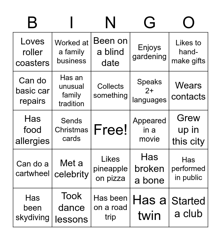 This bingo card has a free space and 29 words: Has been skydiving, Has won at a casino, Sends Christmas cards, Rides horses, Loves roller coasters, Been on a blind date, Has an unusual family tradition, Met a celebrity, Appeared in a movie, Took dance lessons, Grew up in this city, Started a club, Has been on a road trip, Has a twin, Wears contacts, Screams during scary movies, Likes pineapple on pizza, Can do a cartwheel, Likes to hand-make gifts, Has food allergies, Has broken a bone, Good cook, Speaks 2+ languages, Can do basic car repairs, Enjoys gardening, Worked at a family business, Has performed in public, Collects something and Never flown in an airplane.