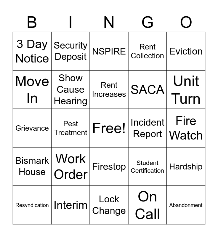 This bingo card has a free space and 24 words: Work Order, Interim, Rent Increases, Resyndication, Eviction, 3 Day Notice, Move In, Security Deposit, Incident Report, Firestop, SACA, Grievance, Student Certification, Hardship, Show Cause Hearing, On Call, Fire Watch, NSPIRE, Unit Turn, Pest Treatment, Abandonment, Bismark House, Rent Collection and Lock Change.