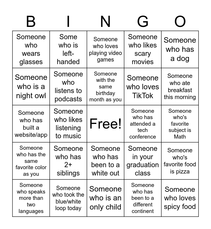 This bingo card has a free space and 24 words: Someone who has 2+ siblings, Someone who took the blue/white loop today, Someone with the same birthday month as you, Someone who speaks more than two languages, Someone who has a dog, Someone who wears glasses, Someone who is a night owl, Some who is left-handed, Someone who has attended a tech conference, Someone who has been to a white out, Someone who loves TikTok, Someone who has built a website/app, Someone in your graduation class, Someone who's favorite food is pizza, Someone who listens to podcasts, Someone who has been to a different continent, Someone who's favorite subject is Math, Someone who loves playing video games, Someone who ate breakfast this morning, Someone who likes listening to music, Someone who loves spicy food, Someone who has the same favorite color as you, Someone who likes scary movies and Someone who is an only child.