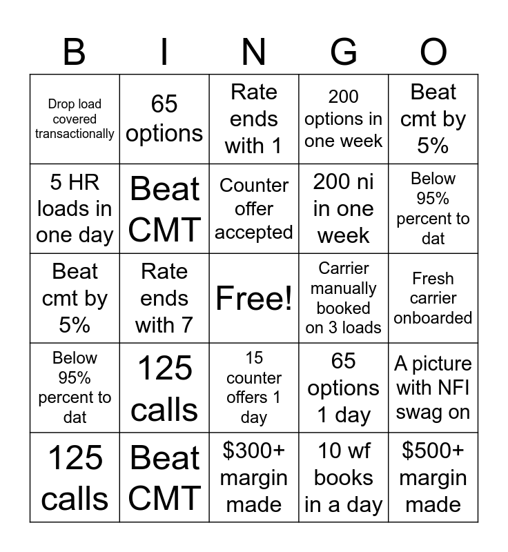 This bingo card has a free space and 33 words: Rate ends with 1, Rate ends with 3, Rate ends with 7, Carrier manually booked on 3 loads, Below 95% percent to dat, Beat CMT, Beat cmt by 5%, 125 calls, 65 options, 15 counter offers, Counter offer accepted, Rate ends with 1, Rate ends with 3, Rate ends with 7, Carrier manually booked on 3 loads, Below 95% percent to dat, Beat CMT, Beat cmt by 5%, 125 calls, 65 options 1 day, 15 counter offers 1 day, Counter offer accepted, Drop load covered transactionally, Fresh carrier onboarded, $300+ margin made, $500+ margin made, 200 options in one week, 200 ni in one week, 5 HR loads in one day, A picture with NFI swag on, 95%+ OTD for the week, 10 wf books in a day and 5 wf books in a day.