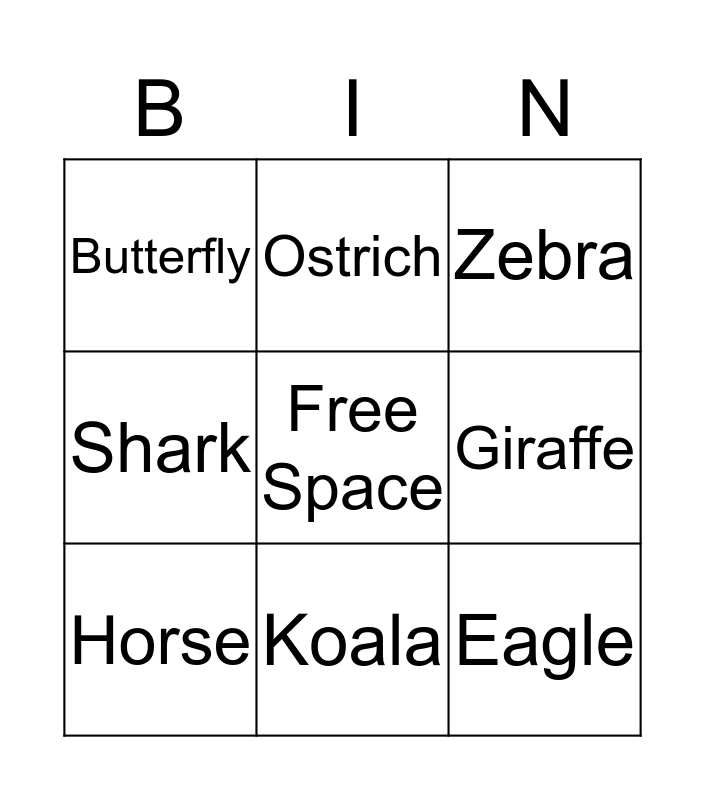 This bingo card has a free space and 8 words: Giraffe, Zebra, Ostrich, Horse, Butterfly, Eagle, Shark and Koala.