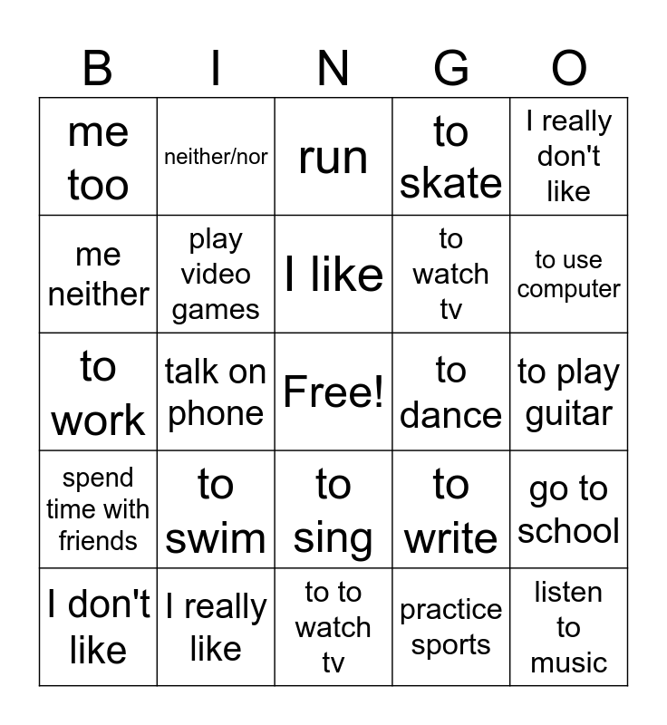This bingo card has a free space and 24 words: to swim, I really like, I like, I don't like, I really don't like, me too, me neither, neither/nor, to dance, to sing, to watch tv, to work, to write, go to school, play video games, practice sports, to play guitar, run, to use computer, talk on phone, listen to music, spend time with friends, to skate and to to watch tv.