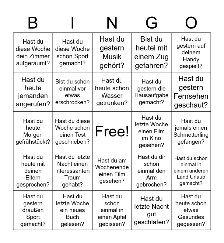 This bingo card has a free space and 24 words: Hast du letzte Nacht einen interessanten Traum gehabt?, Hast du letzte Woche ein neues Buch gelesen?, Hast du heute schon Wasser getrunken?, Hast du gestern draußen Sport gemacht?, Hast du gestern auf deinem Handy gespielt?, Hast du diese Woche dein Zimmer aufgeräumt?, Hast du heute jemanden angerufen?, Hast du diese Woche schon Sport gemacht?, Hast du letzte Woche einen Film im Kino gesehen?, Hast du am Wochenende einen Film gesehen?, Hast du gestern die Hausaufgabe gemacht?, Hast du heute Morgen gefrühstückt?, Hast du dir schon einmal den Arm gebrochen?, Hast du schon einmal in einem anderen Land Urlaub gemacht?, Bist du schon einmal vor etwas erschrocken?, Hast du letzte Nacht gut geschlafen?, Hast du jemals einen Schmetterling gefangen?, Hast du gestern Musik gehört?, Hast du gestern Fernsehen geschaut?, Hast du diese Woche schon einen Test geschrieben?, Hast du heute schon etwas Gesundes gegessen?, Hast du heute mit deinen Eltern gesprochen?, Bist du heutel mit einem Zug gefahren? and Hast du schon einmal in einen Apfel gebissen?.