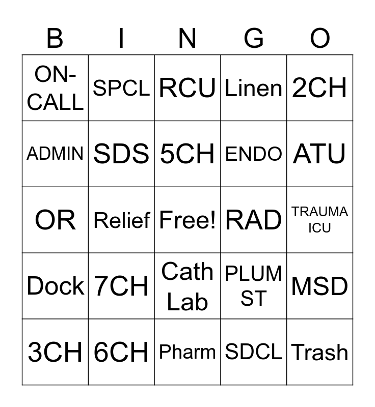 This bingo card has a free space and 24 words: 7CH, 6CH, 5CH, 3CH, 2CH, ON-CALL, ADMIN, SPCL, RAD, Cath Lab, ENDO, OR, PLUM ST, MSD, SDS, SDCL, TRAUMA ICU, RCU, ATU, Relief, Trash, Dock, Linen and Pharm.