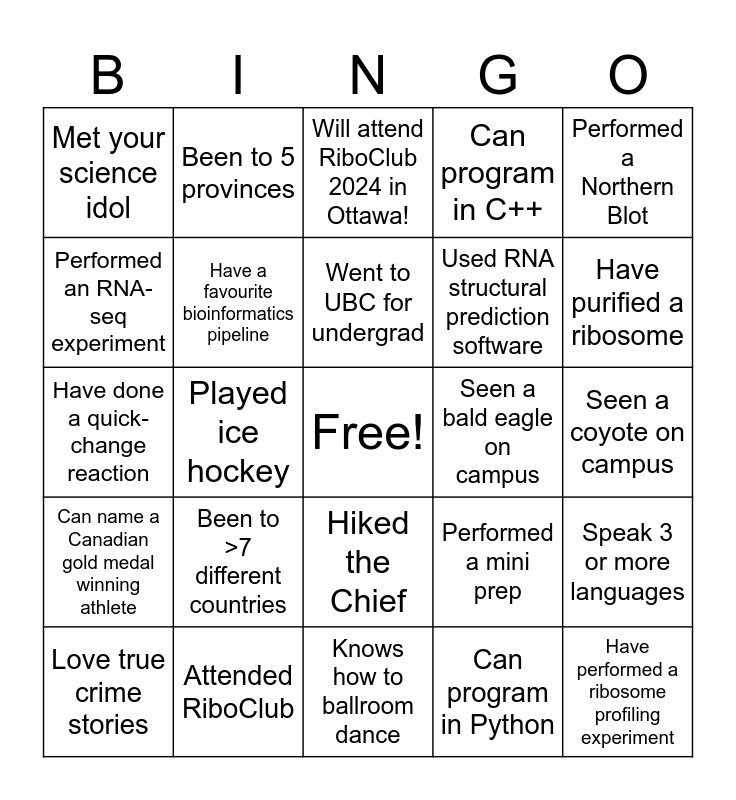 This bingo card has a free space and 24 words: Been to >7 different countries, Attended RiboClub, Went to UBC for undergrad, Love true crime stories, Performed a Northern Blot, Met your science idol, Performed an RNA-seq experiment, Been to 5 provinces, Seen a bald eagle on campus, Hiked the Chief, Used RNA structural prediction software, Have done a quick-change reaction, Performed a mini prep, Speak 3 or more languages, Have a favourite bioinformatics pipeline, Can program in Python, Seen a coyote on campus, Will attend RiboClub 2024 in Ottawa!, Have purified a ribosome, Played ice hockey, Have performed a ribosome profiling experiment, Can name a Canadian gold medal winning athlete, Can program in C++ and Knows how to ballroom dance.