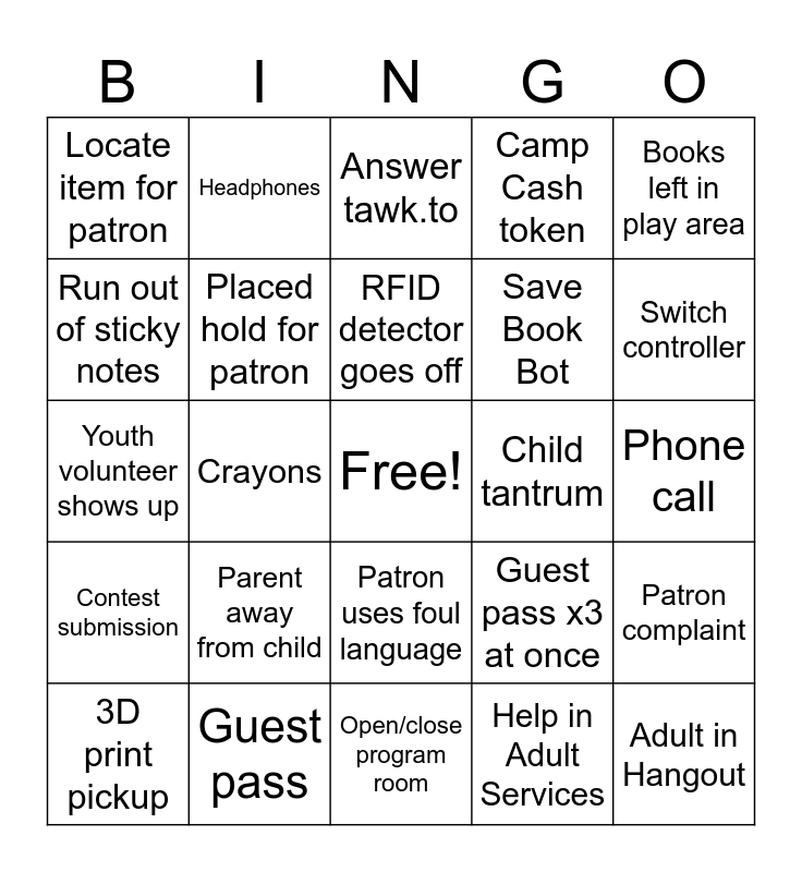 This bingo card has a free space and 24 words: Parent away from child, Guest pass, RFID detector goes off, 3D print pickup, Books left in play area, Locate item for patron, Run out of sticky notes, Headphones, Child tantrum, Patron uses foul language, Save Book Bot, Youth volunteer shows up, Guest pass x3 at once, Patron complaint, Placed hold for patron, Help in Adult Services, Phone call, Answer tawk.to, Switch controller, Crayons, Adult in Hangout, Contest submission, Camp Cash token and Open/close program room.
