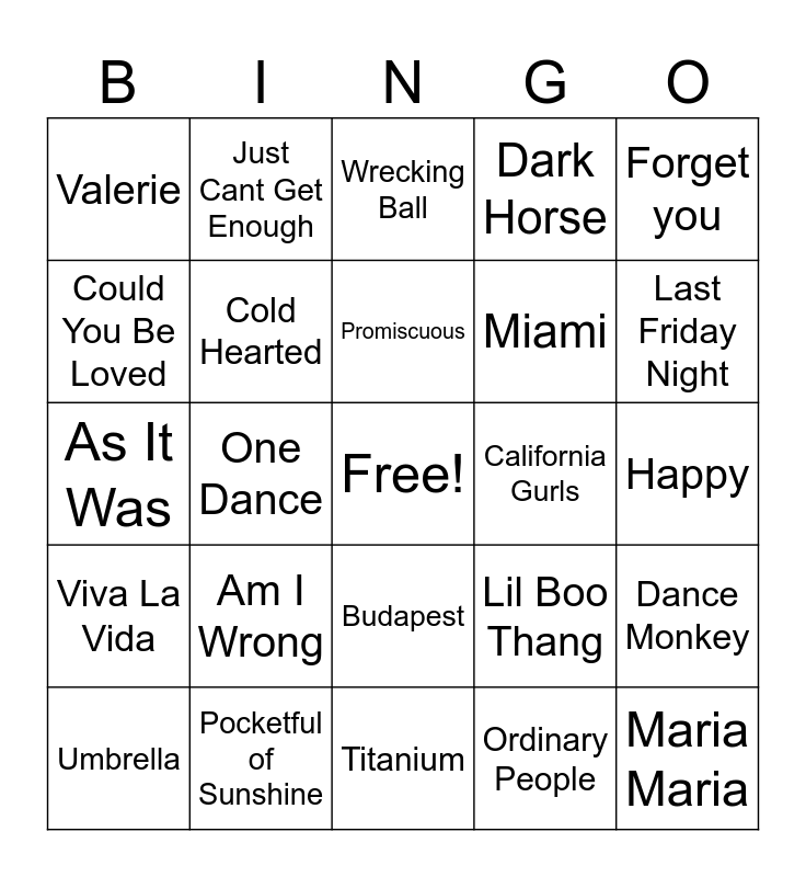 This bingo card has a free space and 53 words: No One, Maria Maria, Doo Wop, Ordinary People, Am I Wrong, Suit & Tie, Just Cant Get Enough, Dirty Diana, Could You Be Loved, Smooth Criminal, Cold Hearted, Perm, Dance Monkey, Lil Boo Thang, Havana, Umbrella, Promiscuous, California Gurls, FourfiveSeconds, Forget you, One Dance, Hit em up Style, Miami, Valerie, Hips Don’t Lie, Pocketful of Sunshine, Genie in A Bottle, Teenage Dream, The Man, Last Friday Night, California Gurls, Too Sweet, A Bar Song, Die With A Smile, Million Dollar Baby, We cant be friends, Dark Horse, Titanium, Wrecking Ball, Timber, Roar, A Sky Full Of Star, Happy, Mambo No.5, Work From Home, Budapest, Baby, Sugar, As It Was, Viva La Vida, Calm Down, Blank Space and Blinding Lights.