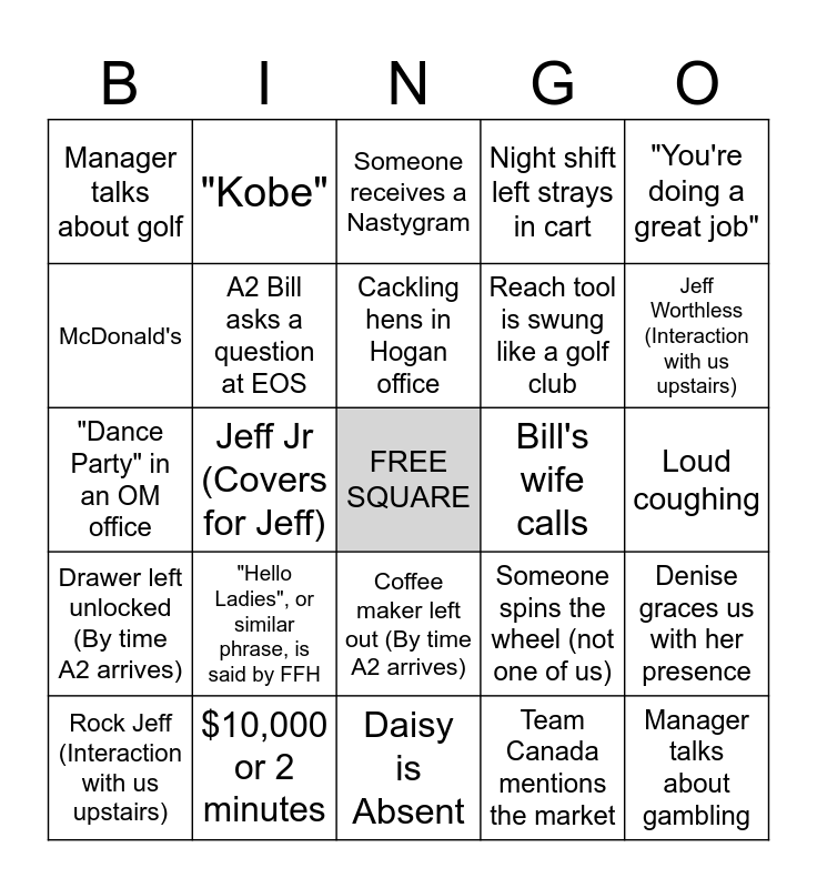 This bingo card has a free space and 49 words: "Madagascar", Manager talks about gambling, Daisy is Present, Daisy is Absent, "Hello Ladies", or similar phrase, is said by FFH, Night shift left desk a mess, "Kobe", Corn brought food for us, McDonald's, The Eric's talk about a trip, A2 Bill asks a question at EOS, Night shift left strays in cart, Denise graces us with her presence, Someone spins the wheel (not one of us), Saeed isn't paying attention during a meeting, Carter is deaf, Cackling hens in Hogan office, Bill's wife calls, Carter's music can be heard through his earbuds, "You're doing a great job", Jeff Jr (Covers for Jeff), Team Canada mentions the market, Manager talks about golf, Reach tool is swung like a golf club, Step Mom comes to see us, Jeff Worthless (Interaction with us upstairs), Rock Jeff (Interaction with us upstairs), Favorite Phil, Coffee maker left out (By time A2 arrives), Drawer left unlocked (By time A2 arrives), Red on Gemba, Visited by Brad, Potluck, Computer left logged in, $10,000 or 2 minutes, Island talk, Blown breaker, Night shift does a bad job, Loud coughing, "Free!", TSS Walkthrough, Copper Forrest LLC, Saeed brought us food, Morning email wasn't sent, "Dance Party" in an OM office, Someone receives a Nastygram, Smelly food (Group consensus), Al brought us donuts and "UN-Free".