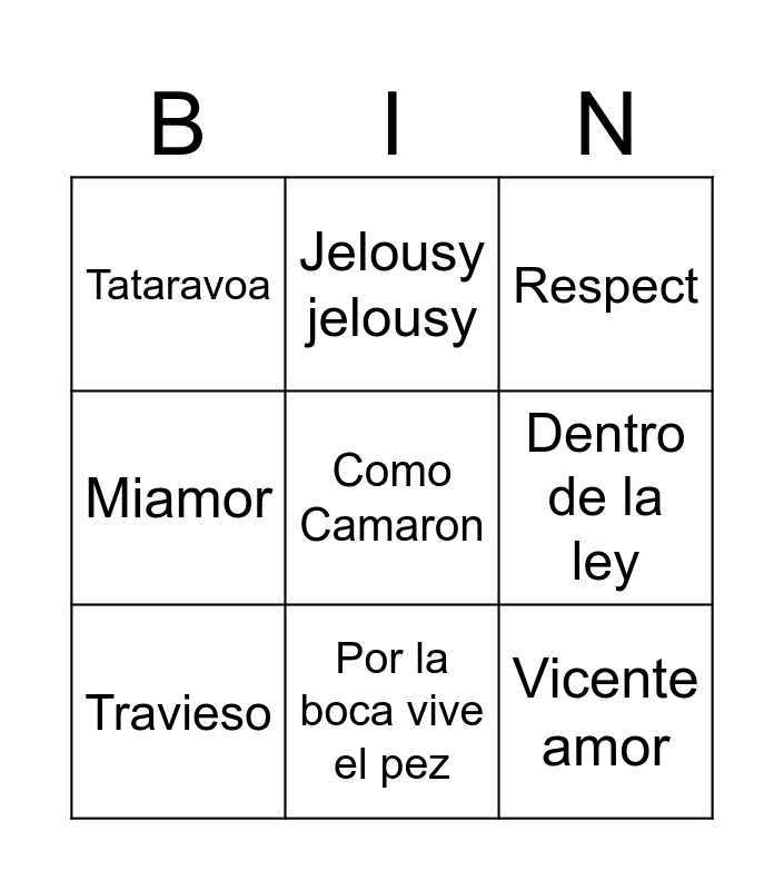 This bingo card has 56 words: Free!, Indi, Las canciones de Juanita, Tataravoa, Chica yeyé, Colores, Travieso, Canela en rama, Vicente amor, Good, luck babe!, Miamor, Please please please, Here comes the sun, Mucho mejor, Blame it on the boogie, Coraline, Como Camaron, Mía, Creep, Olha a explosao, Put your records on, Party on de USA, I want you back, Respect, No puedo vivir sin ti, Por la boca vive el pez, Carolina, Cadillac solitario, Por la raja de tu falda, Ingobernable, If I aint got you, Bada idea right?, Tu foto, REAL GANSTA LOVE, August, Dentro de la ley, La original, Toxic, Hot N Cold, Jelousy jelousy, Si quieres, nana triste, Ya No Te Hago Falta, Con las ganas, El Encuentro, Varre Vasoira, El fin del mundo, Limón y sal, Happier than ever, Guantanamera, Ateo, Fiebre, Chulo, No se ve, Mi abuela es Paul Mccartney and Como si fueras a morir mañana.