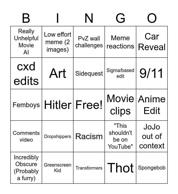 This bingo card has a free space and 24 words: Dropshippers, Greenscreen Kid, Sidequest, Incredibly Obscure (Probably a furry), Car Reveal, Really Unhelpful Movie AI, cxd edits, Low effort meme (2 images), Movie clips, Racism, Sigma/based edit, Femboys, "This shouldn't be on YouTube", JoJo out of context, Art, Thot, Anime Edit, PvZ wall challenges, 9/11, Hitler, Spongebob, Comments video, Meme reactions and Transformers.