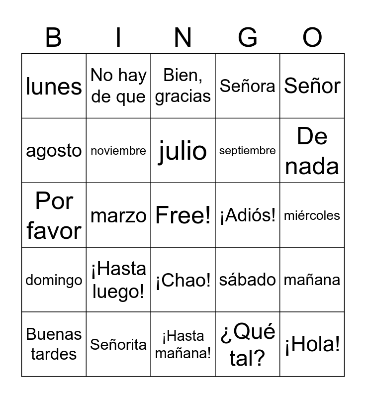 This bingo card has a free space and 45 words: Saludos, ¡Hola!, Buenos días, Buenas tardes, Buenas noches, ¿Qué tal?, Bien, gracias, Muy bien, Señor, Señorita, Señora, ¡Adiós!, ¡Chao!, ¡Hasta luego!, ¡Hasta pronto!, ¡Hasta mañana!, La cortesía, Por favor, Gracias, De nada, No hay de que, ¿Qué día es hoy?, La semana, lunes, martes, miércoles, jueves, viernes, sábado, domingo, hoy, mañana, ¿Cuál es la fecha de hoy?, enero, febrero, marzo, abril, mayo, junio, julio, agosto, septiembre, octubre, noviembre and diciembre.