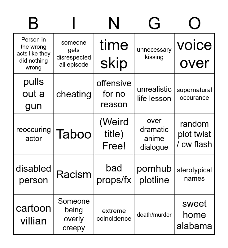 This bingo card has a free space and 24 words: Racism, Someone being overly creepy, offensive for no reason, cartoon villian, voice over, Person in the wrong acts like they did nothing wrong, pulls out a gun, someone gets disrespected all episode, over dramatic anime dialogue, bad props/fx, unrealistic life lesson, reoccuring actor, pornhub plotline, sterotypical names, cheating, death/murder, random plot twist / cw flash, time skip, supernatural occurance, Taboo, sweet home alabama, disabled person, unnecessary kissing and extreme coincidence.