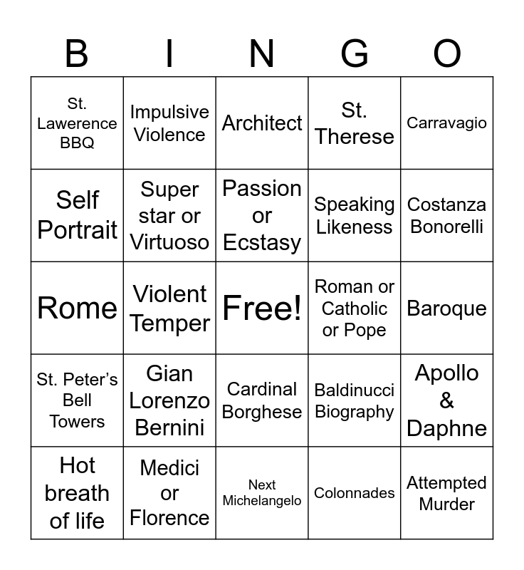This bingo card has a free space and 25 words: Gian Lorenzo Bernini, Next Michelangelo, Passion or Ecstasy, Hot breath of life, Carravagio, St. Lawerence BBQ, Self Portrait, Impulsive Violence, Roman or Catholic or Pope, Cardinal Borghese, Speaking Likeness, Rome, Baldinucci Biography, Apollo & Daphne, Super star or Virtuoso, Francesco Boramini, Baroque, Architect, Costanza Bonorelli, Violent Temper, Attempted Murder, Medici or Florence, St. Peter’s Bell Towers, St. Therese and Colonnades.