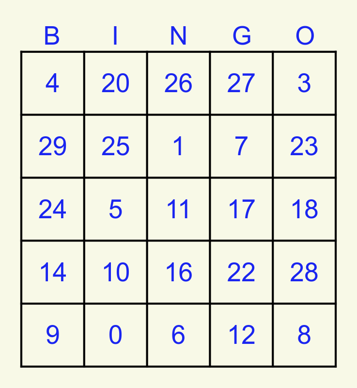 This bingo card has a free space and 31 words: Free!, 0, 1, 2, 3, 4, 5, 6, 7, 8, 9, 10, 12, 13, 14, 15, 16, 17, 18, 19, 20, 21, 22, 23, 24, 25, 26, 27, 28, 29 and 30.