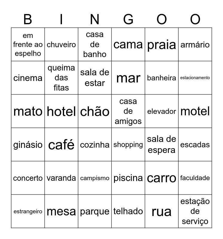 This bingo card has 36 words: piscina, campismo, telhado, cinema, ginásio, casa de amigos, queima das fitas, parque, praia, carro, estacionamento, cama, faculdade, hotel, mar, em frente ao espelho, concerto, elevador, mato, casa de banho, chão, café, shopping, cozinha, sala de espera, chuveiro, banheira, mesa, sala de estar, armário, estação de serviço, estrangeiro, escadas, motel, varanda and rua.