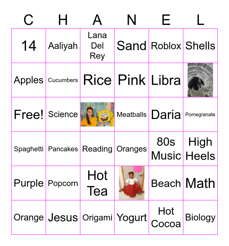 This bingo card has 3 images and 33 words: Hot Tea, Yogurt, Apples, Spaghetti, Meatballs, Cucumbers, Origami, Roblox, Beach, Sand, Math, Science, Pink, 14, Purple, Daria, Free!, Lana Del Rey, Pancakes, Oranges, Reading, 80s Music, Aaliyah, Libra, Jesus, Rice, Shells, Biology, Orange, High Heels, Pomegranate, Popcorn and Hot Cocoa.