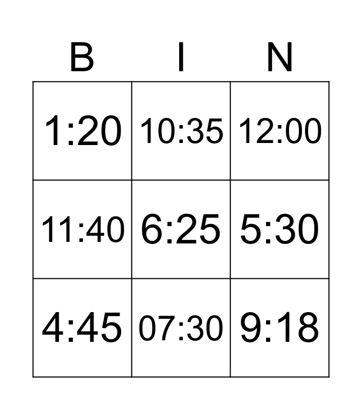 This bingo card has a free space and 8 words: 5:30, 12:00, 10:35, 4:45, 1:20, 9:18, 11:40 and 07:30.