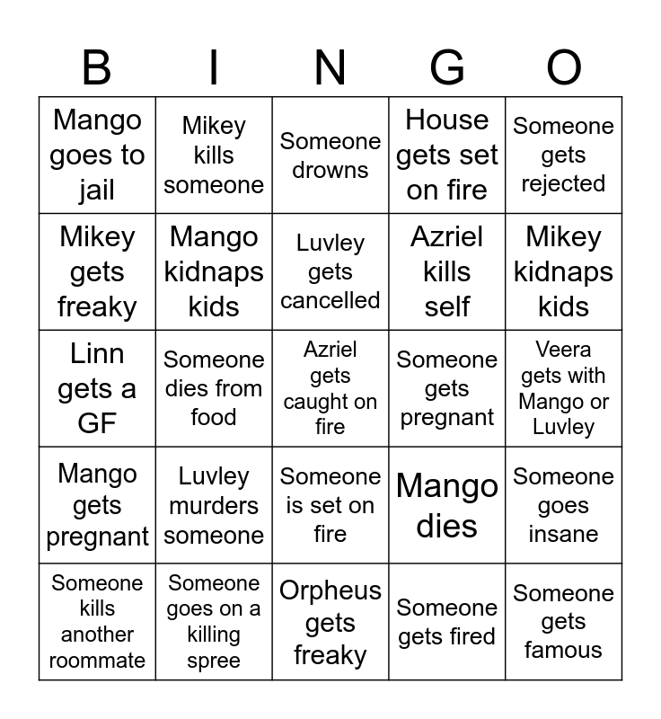 This bingo card has a free space and 24 words: Someone kills another roommate, Luvley murders someone, Luvley gets cancelled, Someone gets fired, Someone gets rejected, Mango goes to jail, Mikey kills someone, Someone drowns, Someone gets pregnant, Veera gets with Mango or Luvley, Linn gets a GF, Mango kidnaps kids, Mango dies, Someone goes insane, Mikey gets freaky, Someone goes on a killing spree, Orpheus gets freaky, House gets set on fire, Mikey kidnaps kids, Mango gets pregnant, Someone dies from food, Someone is set on fire, Azriel kills self and Someone gets famous.