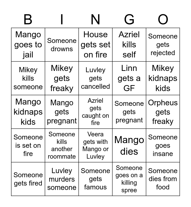 This bingo card has a free space and 24 words: Someone kills another roommate, Luvley murders someone, Luvley gets cancelled, Someone gets fired, Someone gets rejected, Mango goes to jail, Mikey kills someone, Someone drowns, Someone gets pregnant, Veera gets with Mango or Luvley, Linn gets a GF, Mango kidnaps kids, Mango dies, Someone goes insane, Mikey gets freaky, Someone goes on a killing spree, Orpheus gets freaky, House gets set on fire, Mikey kidnaps kids, Mango gets pregnant, Someone dies from food, Someone is set on fire, Azriel kills self and Someone gets famous.