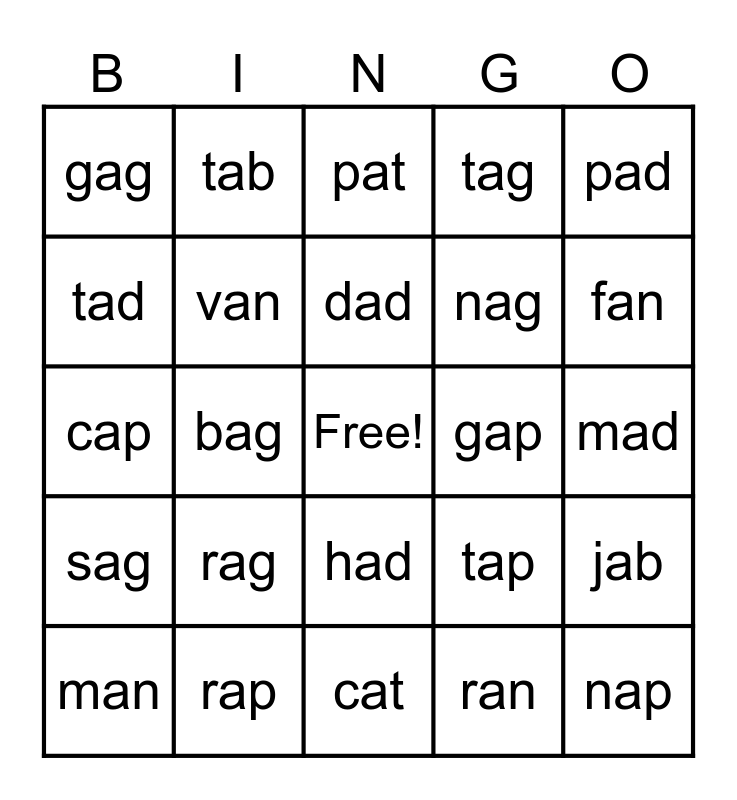 This bingo card has a free space and 63 words: cab, dab, gab, jab, lab, nab, tab, bad, dad, fad, had, lad, mad, pad, sad, tad, bag, gag, lag, nag, rag, sag, tag, wag, dam, ham, jab, Pam, ram, Sam, yam, ban, can, Dan, fan, man, pan, ran, tan, van, cap, gap, lap, map, nap, rap, sap, tap, yap, zap, bat, cat, fat, hat, mat, pat, rat, sat, vat, fax, sax, tax and wax.